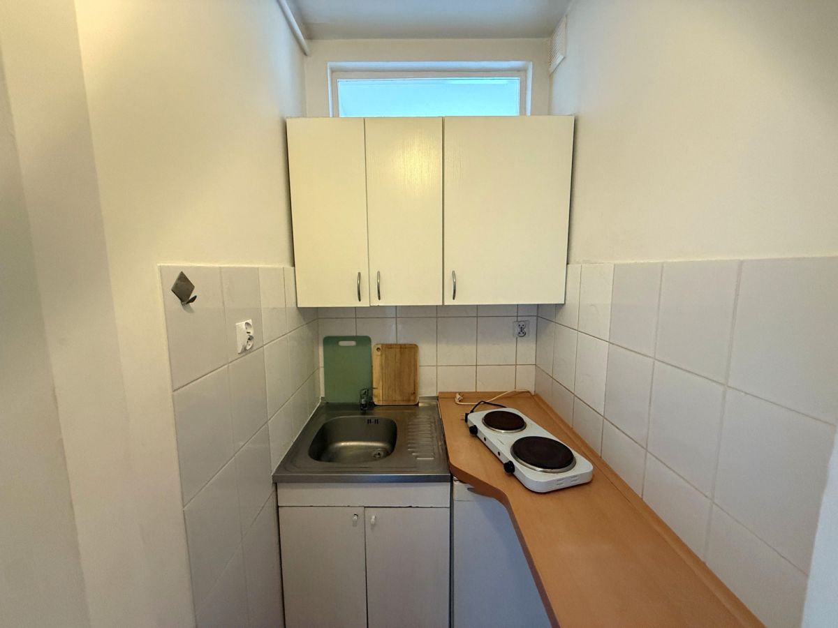 W kuchni znajduje się mała lodówka pod blatem kuchennym oraz elektryczna kuchenka 2 palnikowa (w mieszkaniu nie ma gazu). W korytarzu w zabudowie zlokalizowana jest pralka.